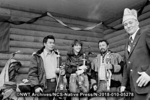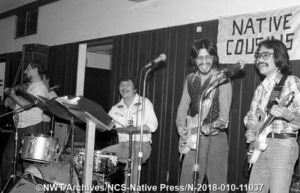 Native Cousins band playing for a dance during the Dene National Assembly held in Fort Resolution September 1983. Left to right: Allen Cardinal, Tony Buggins, unidentified drummer, Cecil Lafferty, and Angus Beaulieu (fiddler). Photo by Lee Selleck. NWT Archives/Native Communications Society fonds – Native Press photograph collection/N-2018-010: 11707