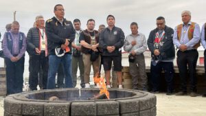 A feeding the fire ceremony at the start of the 54th Dene National Assembly in Dettah on Wednesday. (James O’Connor/CKLB)