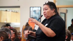 Eileen Beaver of the Salt River First Nation asks a question on the first day of the 2024 Dene National Assembly. (James O’Connor/CKLB)