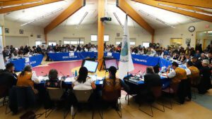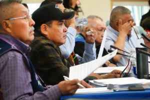 Delegates at work on the first day of the 2024 Dene National Assembly. (James O’Connor/CKLB)