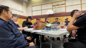 A group discussion on Wednesday night in Behchokǫ̀ at a three-hour after-action review of the 2023 wildfires and evacuations. (James O’Connor/CKLB)