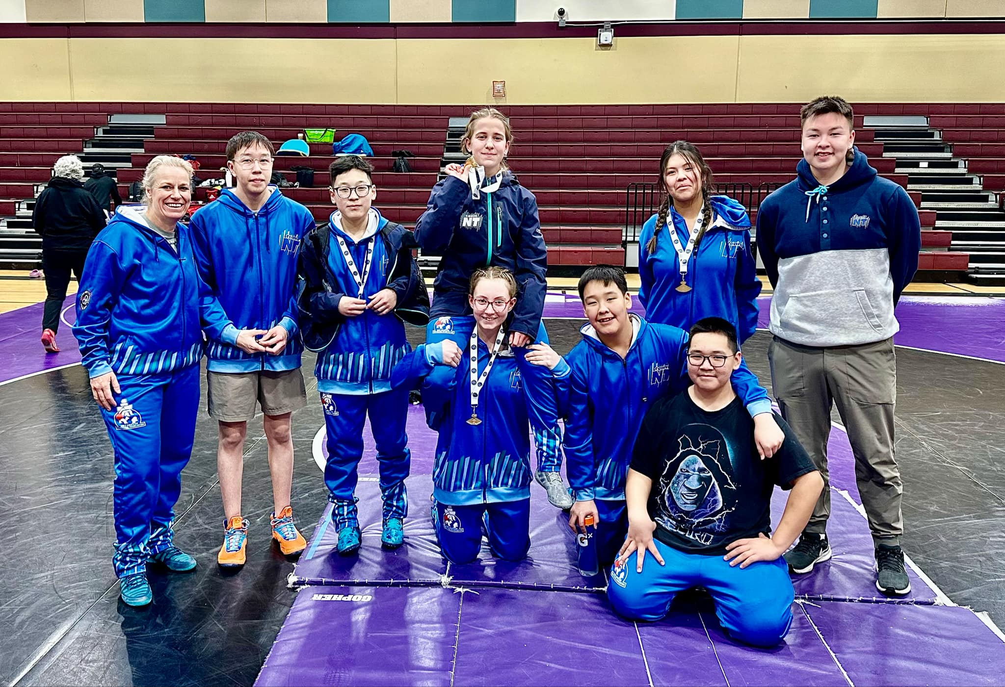 Monique Smith (far left) and Jacob Klengenberg (far right) with Team NT at the 2024 Arctic Winter Games in Alaska. (Photo courtesy of Jacob Klengenberg)