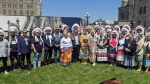 Dene National Chief George Mackenzie poses with other Indigenous leaders on Parliament Hill this week on the occasion of King Charles visit to Canada. (Photo: Dene Nation)