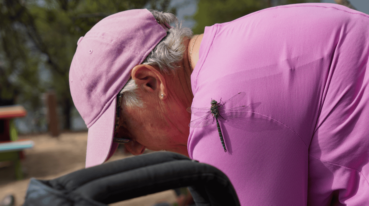 - An aeshana candensis rests on the shoulder of a Folker. (Josie Jiaxuan Wu/CKLB)
