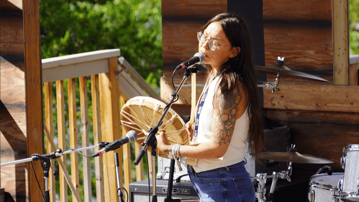 - Cassandra Blondin-Burt drumming and singing at the Cabin Radio stage on Saturday. (Josie Jiaxuan Wu/CKLB)