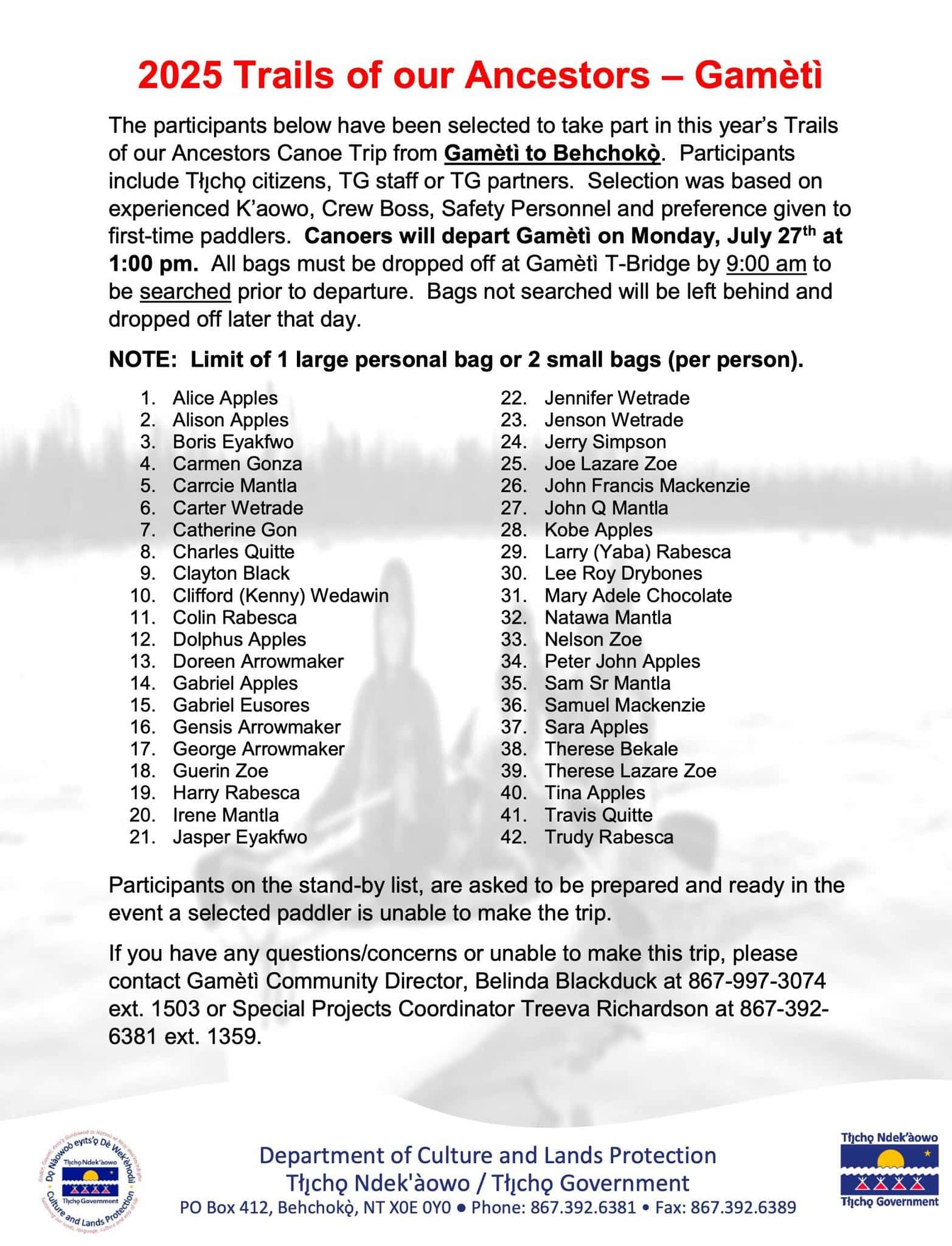 The Whatì paddlers are scheduled to depart Monday, August 4. The program continues, with regular monitoring of conditions to ensure everyone’s safety.