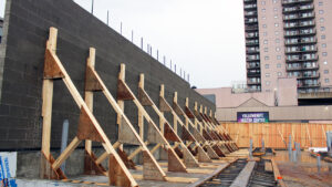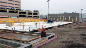 So far, the foundations for the new building have been set, as well as the underground plumbing and mechanical systems. Connections have also been made to the municipal services, and backfill materials have been placed around the building. Plans are also in place to include solar panels and renewable space heating systems.