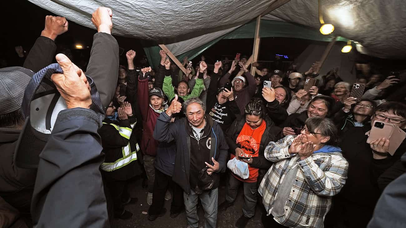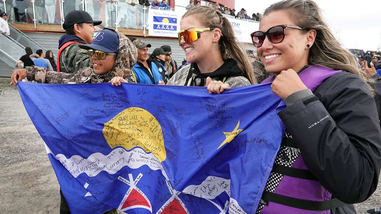 - Janik’oh Camsell and sisters Denae and Cheyenne Lafferty hold a flag on Sunday afternoon in Behchokǫ̀ signed by many of the roughly 160 participants in the 2025 Trails of Our Ancestors journey through Tłı̨chǫ territory. (James O’Connor/CKLB)