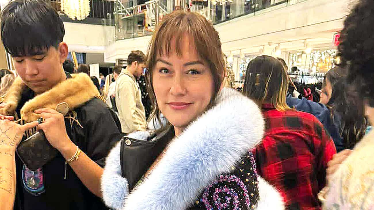 Vashti Etzel at VIFW 2025 wearing shawl made by Yukon Dene youth designer Cohen Quash. (Photo: Submitted)