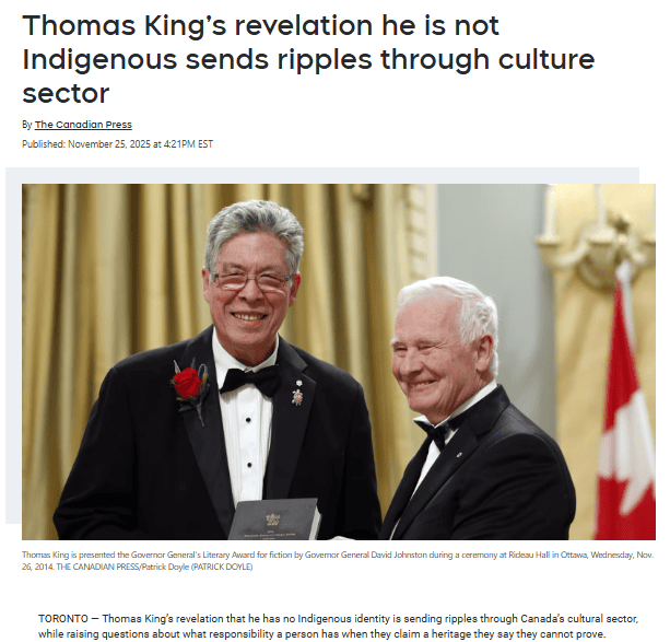 Ontario-based author Thomas King, whose books include 1993’s Green Grass, Running Water and 2012’s The Inconvenient Indian: A Curious Account of Native People in North America, wrote in a Globe and Mail essay published in November that he learned he has no Cherokee ancestry, despite having identified as Cherokee for most of his life.