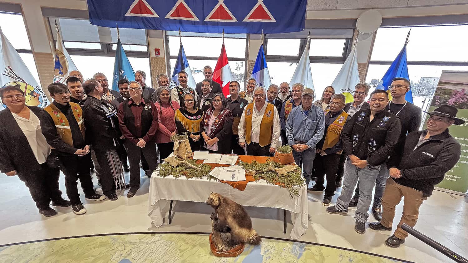 - Participants sort themselves out for a group photo in Behchokǫ̀ in February 2025 at the NWT: Our Land for the Future partnership celebration. (James O’Connor/CKLB)